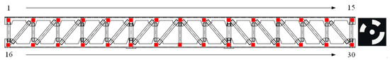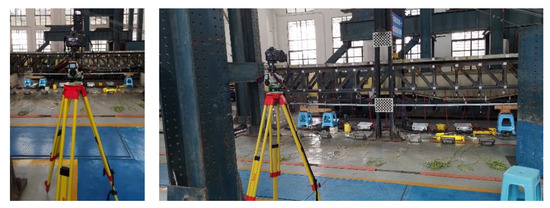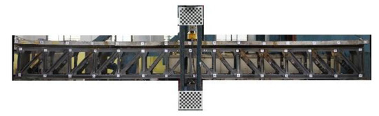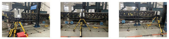 To validate the FFDV extracted from the structure, a Leica scan station (P50 high-speed 3D laser scanner) was used to scan the structure. The scanning resolution was 0.8 mm/10 m, the target acquisition accuracy was 2 mm/50 m, and the noise accuracy was 0.4 mm/10 m. Code marks with a width of 20 mm on the upper and lower gusset plates of the test beam were arranged to validate the accuracy. Figure 8 shows the location and number of the code marks. Figure 9 shows the scanned scene.