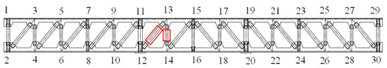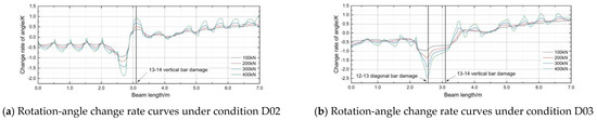 Figure 32a shows the peak value of the rotation-angle change rate under condition D02 on the no. 13 gusset plate, which was situated above the nos. 13–14 damaged member. Figure 32b shows that the abnormal distribution area of the rotation-angle change rate under condition D03 was wider than that under condition D02. The peak value was near the no. 12 gusset plate, and the abnormal distribution area of the rotation-angle change rate was consistent with the position of the two damaged members, i.e., the nos. 12–13 and 13–14 members.