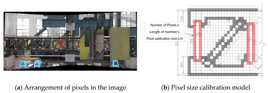 The yellow calibration line in the web member, as shown in Figure 17a, corresponds to a series of pixel matrix arrangements in the image. The actual physical size of each pixel was the monitoring resolution, and Figure 17b shows the calibration model. Yellow calibration lines were drawn in the middle of each vertical bar. The exact length of each calibration line was measured, and the number of pixels represented by the corresponding calibration line was counted. Subsequently, the monitoring resolution was calculated as R = L/n (mm/pixel), and the results are listed in Table 2.