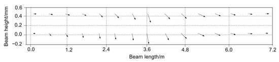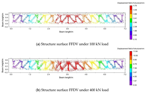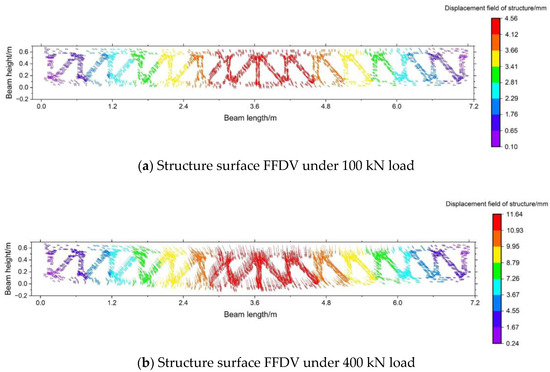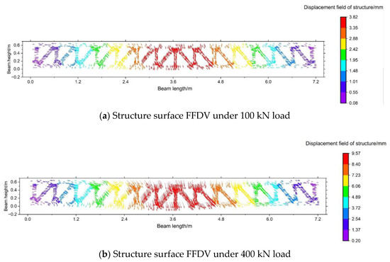 The FFDV distribution presented in Figure 18, Figure 19 and Figure 20 shows that the displacement vector of the top chord steel plate of the test beam is directed toward the mid-span. Meanwhile, the displacement vector of the bottom chord steel plate is directed toward the support, indicating that the top chord steel plate of the test beam is under pressure and that the bottom chord steel plate is under tension. This vector distribution is consistent with the stress characteristics of the test beam under load. In addition, the test beam’s deformation increases with the load. Taking the undamaged condition as an example, the maximum displacement of the test beam under the load of 100kN is 3.82 mm, and the maximum displacement under the load of 400kN is 9.57 mm. This is consistent with the deformation law of the structure under load.