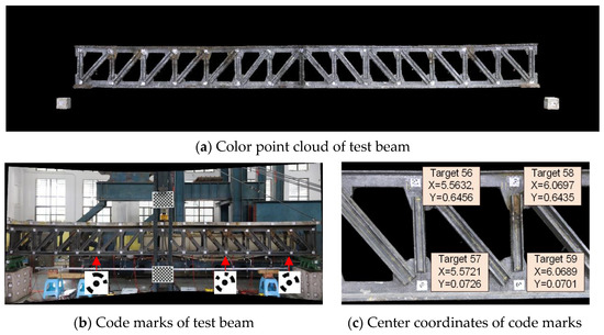 Subsequently, we validated the displacement vector in the plane. Under each operating condition, a Leica ScanStation P50 3D laser scanner was used to scan the test beam. During the scanning, a built-in coaxial camera was used to perform synchronous shooting, and the color point cloud of the test beam was obtained, as shown in Figure 21a. The Leica Cyclone point-cloud processing software was used to automatically extract the center coordinates of the code marks, as shown in Figure 21c.