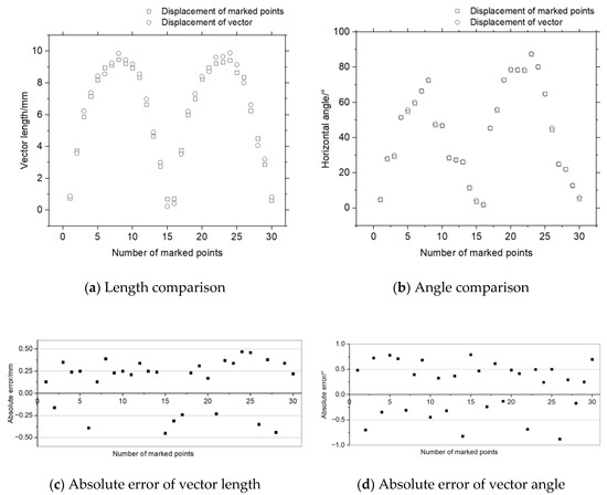 As shown in Figure 23, the vector length error of the code-mark position was within 0.5 mm, and the angle error was within 1°, indicating that the extracted FFDV can accurately reflect the full-field displacement characteristics of the structure.