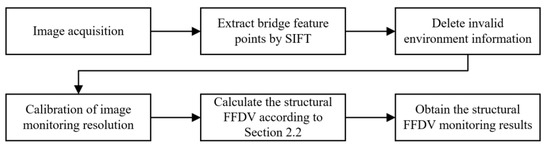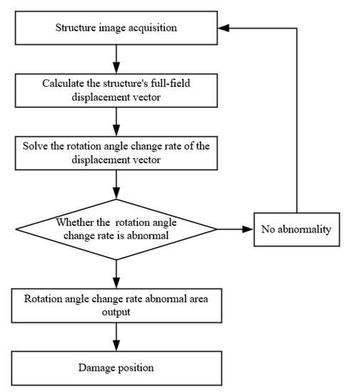 With the results presented above, an FFDV monitoring method based on the natural texture features of the structure is proposed. Furthermore, a damage identification index applicable to the structure’s FFDV is proposed. This index exhibits a peak response to the damage location. We summarize the methods detailed above to form a damage identification program based on the FFDV of the structure, as shown in Figure 36.