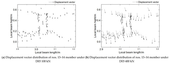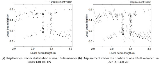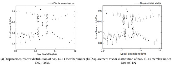 The displacement vectors for the nos. 13–14 damaged vertical member are shown in Figure 25, Figure 26 and Figure 27. Owing to space limitations, only two load levels, i.e., 100 and 400 kN, are shown under operating conditions D01–D03.