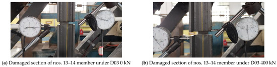 Further tests were conducted to validate the applicability of the damage identification index. The damaged members were repaired under conditions D02 and D03. After repair, the nos. 9–10, 11–12, and 13–14 vertical members were used to damage the local section. After completing a single damage condition, the damaged member was repaired prior to the next damage test. Please refer to Table 4 for the new damage conditions, Figure 33 for the location of the damaged members, and Figure 34 for the member repair and damage.