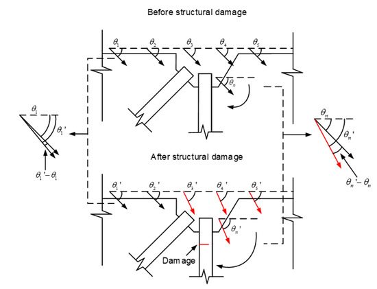 The essence of the structure’s FFDV abnormal angle, as shown in Figure 29, is that damage destroys the structure’s deformation coordination and expresses damage information via the FFDV’s abnormal rotation angle. This property can be used to analyze the FFDV’s rotation-angle change rate before and after damage. Figure 30 shows the solution model for the vector’s rotation-angle change rate, and Equation (1) shows the equation to calculate the vector’s rotation-angle change rate.