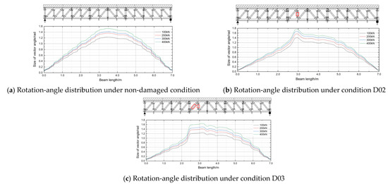 To validate the proposed damage identification index, the rotation-angle distribution of the upper chord steel plate edge was extracted. Figure 31 shows the rotation-angle distribution curve of the upper chord steel plate edge.