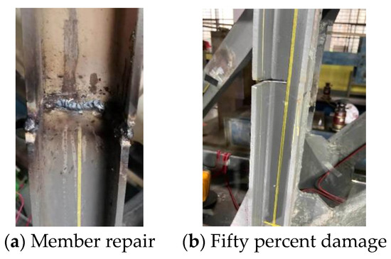 Subsequently, the damaged member of the test beam was simulated by cutting. Table 1 lists the damage conditions for the test beams. Figure 10 shows the number and positions of the damaged members, whereas Figure 11 shows the damage to the members of the test beam.