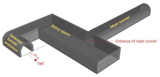 A protective tunnel with an arched entrance was considered, as shown in Figure 1. This tunnel consisted of an external tunnel entrance, entry space, and main tunnel. The height of the tunnel was 7.2 m for all of the parts. The wall thickness of the tunnel entrance was 1 m, and the outer and inner widths were 8.9 m and 6.9 m, respectively. The entry space had plane dimensions of 53.4 × 17.7 m and a wall thickness of 0.6 m. For the main tunnel, the wall thickness and length were 0.6 m and 56 m, respectively. This length was considered sufficient when considering the distance at which the blast waves stabilized after entering the main tunnel. Note that the wall thicknesses were required despite the tunnel model being rigid because the model should contain one or more volumes that are defined as watertight objects [18].