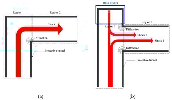 The second method to reduce blast overpressures inside the tunnel involves the use of a blast pocket at the corners where the direction of the blast waves changes. Figure 3 shows the blast wave propagations at the corners with and without a blast pocket. The blast waves initially propagate from region 1, are refracted, and then propagate into region 2 owing to the effect of shock-wave diffraction at the corner, as shown in Figure 3a. As shown in Figure 3b, when a blast pocket is applied to the corner, some of the initially propagated blast waves from region 1 (Shock 1) are refracted and propagated into region 2, whereas some (Shock 2) propagate after a while into region 2 via the blast pocket. Since Shock 2 propagates later, after Shock 1, the maximum overpressures at the front of Shock 1 can be mitigated compared to the case without the blast pocket. The effects of the blast pocket on the overpressure mitigation, along with the effects of the slope angle, were studied through numerical analysis.