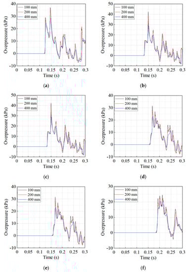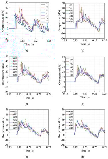 Figure 5 shows the results of overpressure histories calculated at forty-two monitoring locations for the mesh size of 100 mm. For monitoring locations, G1 to G7, the maximum overpressures were observed at the first peaks, namely near the shock front at approximately t = 0.13 s, as shown in Figure 5a. The overpressures thereafter fluctuate continuously due to repeated shock-wave reflections by the inside walls and diffractions at the corners. Similar observations for other monitoring locations were made, as shown in Figure 3b–f. The overpressure histories simulated for the cell sizes of 200 mm and 400 mm were similar to those for the 100-mm cell size, and these are not presented in this study.