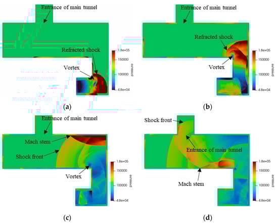 Blast wave propagation in the original protective tunnel for cell size = 100 mm. (a) t = 51 ms; (b) t = 113 ms; (c) t = 161 ms; (d) t = 211 ms.