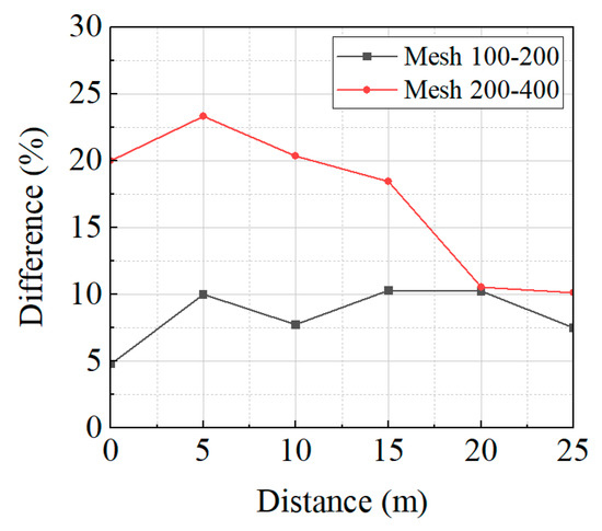 The maximum overpressures, PM, obtained in Figure 7 by varying the distance from the main tunnel entrance for cell sizes of 100 mm, 200 mm, and 400 mm are shown in Figure 8, and the differences in the maximum overpressures for cell sizes of 100 mm and 200 mm and those of 200 mm and 400 mm are shown in Figure 9. As shown in this figure, the results for cell sizes of 200 mm and 400 mm do not converge, with differences ranging from approximately 10% to 24%. For cell sizes of 100 mm and 200 mm, mesh converged results were obtained with differences of less than 10% for all distances. Based on the mesh sensitivity study, to obtain mesh convergence in the considered locations of the main tunnel, the cell size is recommended to be less than 200 mm, noting that the mesh sensitivity would be dependent on the size of the given tunnel model. The optimal mesh size for the numerical model of the protective tunnel was considered to be between 100 mm and 200 mm, considering the numerical accuracy and computational expense. The results of the mesh sensitivity analysis are listed in Table 2.
