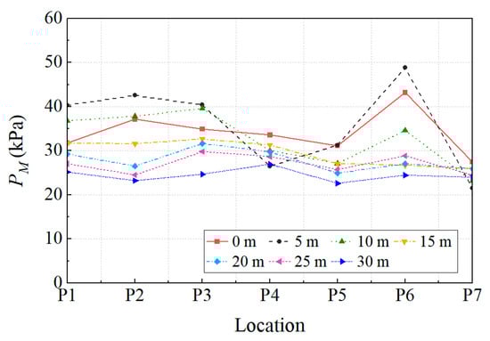 The results of the stability analysis of the overpressure in the main tunnel are shown in Figure 10, which shows the maximum overpressures, PM, at seven monitoring locations as a function of the monitoring location and distance. The locations P1 to P7 correspond to the seven monitoring locations for each distance, that is, G1 to G7 for distance = 0 m and G8 to G14 at distance = 5 m. For distances of 0 m, 5 m, 10 m, and 15 m, the overpressures fluctuate significantly, indicating the zone where the overpressures are unstable. The overpressures were considered to be stabilized at distances of 20 m, 25 m, and 30 m. The overpressures in the main tunnel for the blast analysis presented in Section 5 were evaluated at distances greater than 20 m.