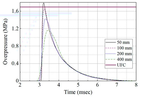 The overpressure histories calculated at the monitoring location GC for the four cell sizes are shown in Figure 12. The maximum overpressures at the external tunnel entrance appeared to converge for the 50-mm and 100-mm meshes (1.76 MPa and 1.60 MPa, respectively). In addition, these two mesh sizes led to differences of 4% and 6%, respectively, compared with that (1.70 MPa) estimated using the UFC 3-340-02 chart. Therefore, the numerical model was considered to be validated.
