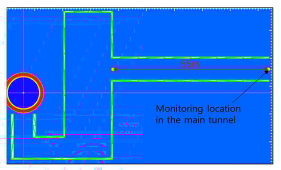 A validation study was performed to demonstrate the robustness of the proposed numerical model for a protective tunnel. Mesh convergence for the overpressures in the main tunnel was obtained for cell sizes of 100 mm and 200 mm. These overpressures were stabilized at distances greater than 20 m from the entrance of the main tunnel. For the external entrance of the tunnel facing the outside, the overpressures converged for cell sizes of 50 mm and 100 mm, and the accuracies of the numerical predictions were validated using empirical charts in UFC 3-340-02. A blast analysis was performed using a cell size of 100 mm and a distance of greater than 20 m from the main tunnel entrance to investigate the effects of the slope angle at the external tunnel entrance and blast pocket on the overpressure mitigation in the main tunnel.