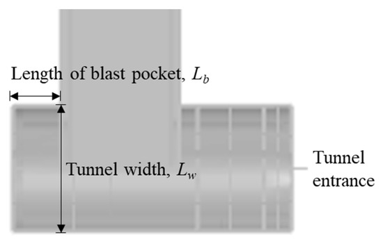 The shapes of the external tunnel entrance varying the slope angle for Lb/Lw = 1.0 are shown in Figure 14, and these are the same for Lb/Lw = 0.5 and 1.5. The shapes of the tunnel model varying the ratio of blast pocket length, Lb, to the tunnel width, Lw, are shown in Figure 11. Three blast pockets were arranged where the direction of the blast waves changes; that is, at the corners, as shown in Figure 15b–d. Figure 16 shows the length of the blast pocket, Lb, and the tunnel width, Lw, for the blast pocket A with a ratio of 0.5.