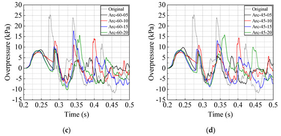 Figure 20a,b show the overpressure distributions for Model Arc-90-0 (original) at t = 73 ms and Model Arc-60-05 at t = 77 ms, respectively. Evidently, the overpressures for Model Arc-60-05 at the shock front and Mach stem were slightly smaller than those for the original because some of the shock waves propagated inward via the first blast pocket. This is similarly observed for the second blast pocket, as shown in Figure 20c,d. The blast overpressure reductions for all the numerical models are listed in Table 5.