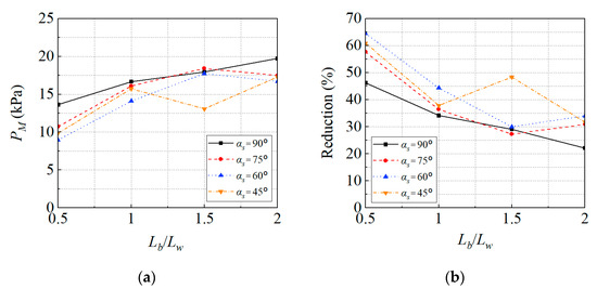 Maximum overpressures and reduction varying Lb/Lw for slope angles of external tunnel entrance of 90°, 75°, 60° and 45°. (a) Maximum overpressure; (b) Overpressure reduction.