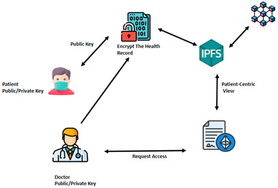 Cryptographic methods guarantee the privacy and integrity of blockchain data. Figure 5 depicts the interaction between patients and their doctors while examining health records. The doctor initiates the process by requesting access permission to retrieve the information stored in the IPFS. Depending on the data fields requested, this generates a patient-centric view of the records rather than disclosing all the patient’s information. The session key, Sk, is used to store the encrypted patient-centric view in IPFS and to retrieve records in a finite period. After doctors and patients have received encrypted patient-centric views and Sk, doctors may decrypt the Sk and patient-centric views for the process of updating the record.
