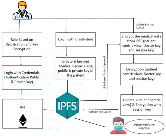 In the event that the doctors need to update the patient’s health record, one can allow or block the process by granting or revoking access, respectively. The temporary view, or patient-centric view, of the health record, is constructed from IPFS. In this view, the doctor is allowed to update the documentation before the patient commits to the update using their key pairs to save the updated files in IPFS. In this way, this framework would ensure the interoperability of the mechanism.