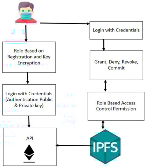 The process of role-based access is initiated once doctors request permission to the IPFS health record of patients, in which patients are in control to allow or revoke access for authorized users as shown in Figure 6. With the patient’s consent, the doctor may create, view, and modify medical records before the patient commits the update to permanent storage. The patient-centric view of the health information can only be accessed by other participants in this health chain architecture for a given session, provided their ownership and object ID match the patients’ [27]. These stakeholders include insurance agents, pharmacists, and researchers. As for laboratory technicians, they can only modify or update patients’ medical records after the approval of the patient and the doctor. The regulations, access control, and privacy agreement are provided by authorization of smart contracts and are governed by the Ethereum blockchain. This methodology adheres to certain situations: