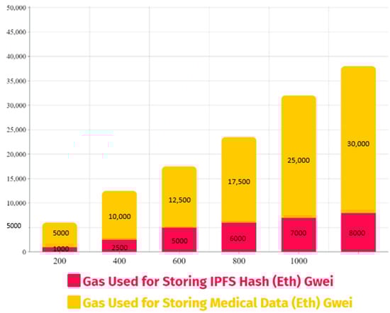 In the proposed system, we define the cost for the actual transactions and time taken to execute for each transaction. The cost is calculated by ether = gas used × gas price; “gas used” means the constant computational cost. The network adjusts the price of gas to compensate for changes in the value of ether [8]. Thus, the total transaction costs (ether) for the accessibility of health data remain relatively constant. Regarding the paying segment, all participants must pay gas for performing an operation in SC. Therefore, the automated SC process would result in significant cost savings for the patient. In the implemented PCEHRM-SC prototype, we have set a gas limit of 30,000, with each gas unit fixed at 2 Gwei.