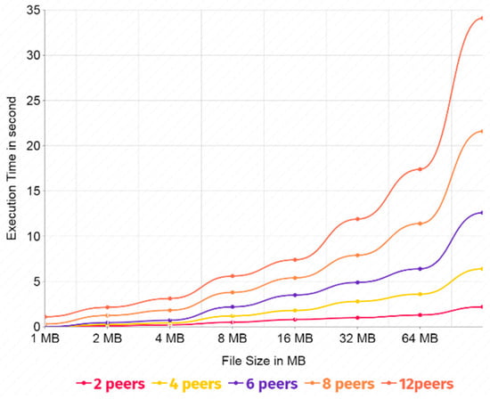 Our proposed system stores the media in IPFS, and IPFS stores media with the help of peers. Figure 15 shows that as the number of peers accessing the transaction or contributing to image storage increases, the execution time, or the time required to retrieve the media, increases. Depending on the previous section, the larger the image or report size, the longer it takes to access the same.