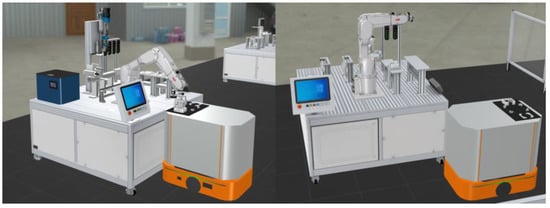 In this section, only AGVs and single stations are taken as examples. As shown in Figure 3, the light weighted AGV and workstations are imported into the virtual engine platform. The operation logic and collision sensing device of AGV and station are added, and the sensing signal and data interface are configured. Socket communication based on a TCP/UDP protocol is used in the platform, which transmits the collected data of the physical equipment to its digital twin through the network port and matches the relevant signals.