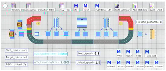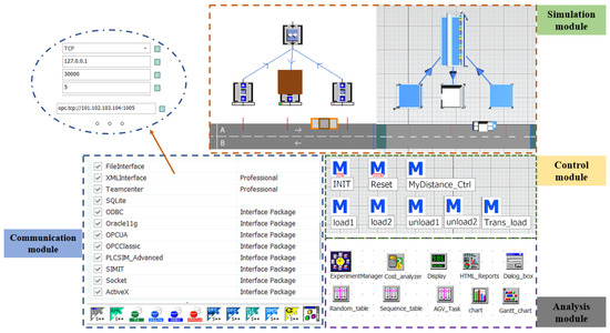 In this section, only AGVs and single stations are taken as an example. The software used to build the simulation analysis model is Plant Simulation. As shown in Figure 4, the model can be divided into four modules: a simulation module, control module, analysis module and communication module. The simulation module simulates the production process of the actual workshop production line. The control module is responsible for the optimal control of the scheduling algorithm, production scheduling, and path planning during transportation. The analysis module generates the corresponding analysis report chart during the simulation to prove the applicability of the transportation plans and scheduling algorithms. The data is stored in MySQL (My Structured Query Language) database for reference of the service management system. The communication module provides many interfaces for dynamic interaction between simulation models and physical plants, such as OPC UA, PLCSIM, ODBC (Open Database Connectivity), SQL and Socket. At the same time, the production simulation analysis models are integrated with MES, WMS and Excel to obtain real-time logistics data, form dynamic reports, and feedback the status of the production line in a timely and visual manner.