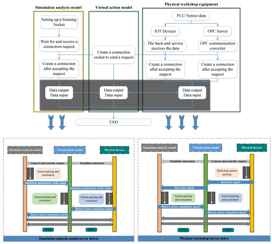 A high fidelity digital twin receives data from a physical device and evolves in real time, so it keeps consistent contact with physical device objects throughout their life cycle. To ensure real-time data exchange in a digital twin system, the interaction between a virtual action model, simulation analysis model and a physical device should be established as shown in Figure 5. The virtual action model and the simulation analysis model communicates via the TCP protocol. The IOT (Internet of Things) equipment in the physical workshop acquires PLC/sensor data and uploads it in JSON (JavaScript Object Notation) format in real time. The digital twin then acquires the data from the server in real time through socket communication. Physical devices communicate with the digital twin in real time as well. At present, the common PLC/sensor supported communication protocols in intelligent factories include OPC UA and Modbus. At the same time, a communication converter is required between different communication protocols. In the data exchange among the virtual action model, simulation analysis model and physical equipment, data input and output logic can be divided into the physical workshop server driver and the simulation analysis model server driver. The physical workshop server driver drives the virtual action model and the simulation analysis model with the data collected from the real physical workshop. The simulation analysis model server driver is used to optimize the simulation based on the received service management system data or the corresponding transportation route, and drive the virtual action model and physical equipment. The simulation analysis model server driver focuses on pre-validation, algorithm analysis and demand forecasting.