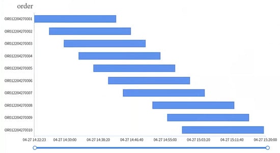 The dynamic task list consists of order scheduling and the loading/unloading signal. Both will assign transportation tasks to AGVs. The loading/unloading signal is the signal sent by each processing station. When a station completes the current processing step, an AGV needs to transport the cargo to the next station for processing. Orders issued by customers are scheduled through MES. Order scheduling can reasonably allocate coefficients according to the customer classification principle, order priority principle, process flow principle and order placement time principle, and the order scheduling sequence obtained is written into the dynamic task list. The order scheduling is shown in Figure 7. The customer priority, order priority, order placement time and process complexity level need to be normalized, and the data is mapped to 0–1 by changing the original data.