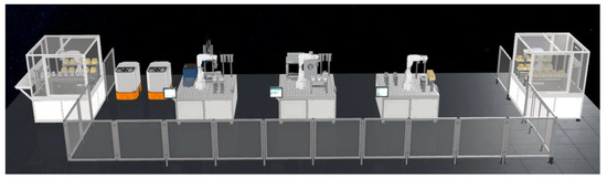 The virtual twin model is built for the real assembly line, including the simulation analysis model and the virtual action model. The simulation analysis model is shown in Figure 10, which contains many functional tools. The symbols of each function module in the simulation analysis model are shown in Table 3. The virtual action model is shown in Figure 11.