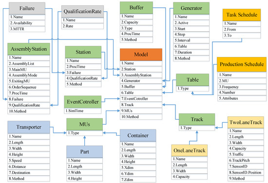 The virtual twin model of the assembly line interacts with the real-time data of the real production line. In the model, static data such as equipment failure rate and mean time to repair are loaded firstly. Each action event is coded with signals, and in the virtual twin model trigger signals are set for each object. Through the communication protocol, event signals are associated with model object signals. The equipment data and production task data generated in real time can be used to build a data model as shown in Figure 12. The data is classified and stored to facilitate the direct use in the simulation process. In this case, the assembly line based on the digital twin system reads data from the database at a time interval of 100 ms, realizing the restoration of the real production line and visual real-time monitoring.