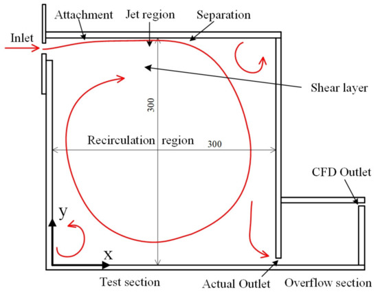 The reduced-scale experimental configuration of Van Hooff et al. [27] is shown in Figure 1. The test section is a cube with the lengths L = 300 mm. There is a ventilated slot inlet 5 mm below the top of the left wall with a height of 20 mm. The outlet of the test section is at the bottom of the right wall, with a height of 5 mm and a thickness of 8 mm. Downstream of the test section is the overflow section. The overflow section is 120 mm long and 80 mm high. At the top of the right wall of the overflow section, there is a 5 mm high CFD outlet. The working medium is water at 20 °C. The cases studied in this paper are mixing ventilation: the wall jet is injected into the room from the upper left corner, dilutes and mixes with the air in the room, and finally, the mixed air is discharged from the outlet at the lower right corner of the room. This case is one of the most commonly used and researched in the study of building ventilation, which was proposed by Chen [30] and Nielsen [26].