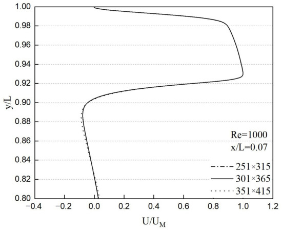 To verify that the grid is independent of the final calculated flow results, three grid sizes 251 × 315 = 79,065, 301 × 365 = 109,865, and 351 × 415 = 145,665 of the test section are used for grid independence verification. As shown in Figure 3, with the increase in grid numbers, the dimensionless x-velocity profiles calculated by the AB model at x/L = 0.07 of the three grid sizes have a good consistency. Note is the local maximum time-averaged x-velocity. This shows that the increase in grid density has little impact on the results. Considering the available computing resources and numerical simulation cycles, a grid size of 301 × 365 = 109,865 is chosen for simulation. The minimum orthogonal quality of the grid is 0.99, the maximum skewness is 0.004, and the maximum aspect ratio is 19.14.