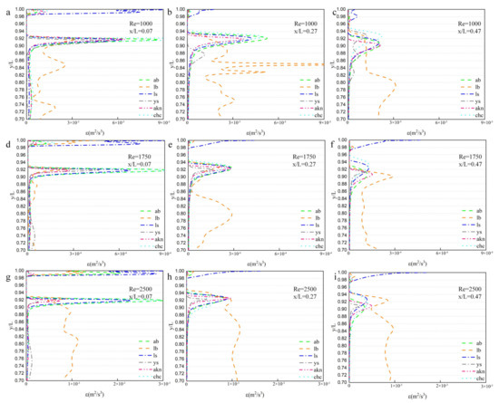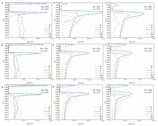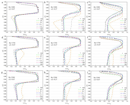 At x/L = 0.27 (Figure 4b,e,h), the LB and YS models still predict totally wrong results of velocity profiles. The AKN model provides a good agreement with the measurement data at Re = 1000 while performing poor at Re = 1750 and 2500. At x/L = 0.07 and 0.27, the thickness of boundary layer predicted by six models is thinner than that of PIV measurements, where the jet has not yet separated from the wall. This may be due to a seriously too-low level of ε near the wall in separated flows or flows approaching separation [37]. When the flow does not separate from the wall (at x/L = 0.07 and 0.27), the results obtained by AB and LS models are more accurate.