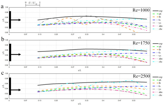 In Figure 5a, it can be seen that the LB and YS models perform quite poorly for Re = 1000. The maximum value of y/L predicted by the CHC model is still increasing after x/L = 0.53. The trend of the results predicted by the AB and AKN models is in good agreement with the experimental results. In Figure 5b,c, the LB and YS models predict better results for Re = 1750 and Re = 2500 than the result for Re = 1000. By contrast, the CHC model predicts the worst result when Re is high (Re = 2500).
