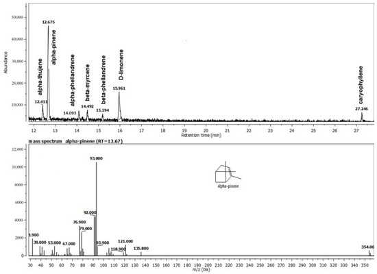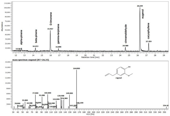 By using the gas chromatography-mass spectrometry (GC-MS) technology, the essential oils were examined. Due to the volatile and semi-volatile components (monoterpenes and sesquiterpenes) of essential oils being easily separated, recognized, and quantified, GC-MS is the most popular analytical approach for the examination of essential oils. The GC method is trustworthy because it can identify analytes in minute quantities (traces) recovered from gels and because its mass spectrometry (MS) coupling provides structural information about the detected compounds [17,18,19].