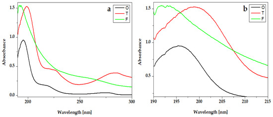 UV-VIS absorption spectra of essential oils Oregano® (O), Thieves® (T), and Frankincense® (F): (a) full-length spectra and (b) peaks details.