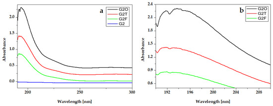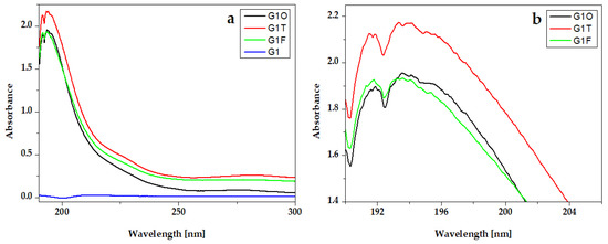 In the experimental hydrogels, G1T and G2T containing the Thieves® blend had an absorption peak at 194 nm. An intense peak at 191 nm is registered for hydrogels G1O, G2O, G1F, and G2F, which present similar absorption spectra. Gels whose composition contains Kaqun water (Figure 6) have a less obvious band in the 250–300 nm range.