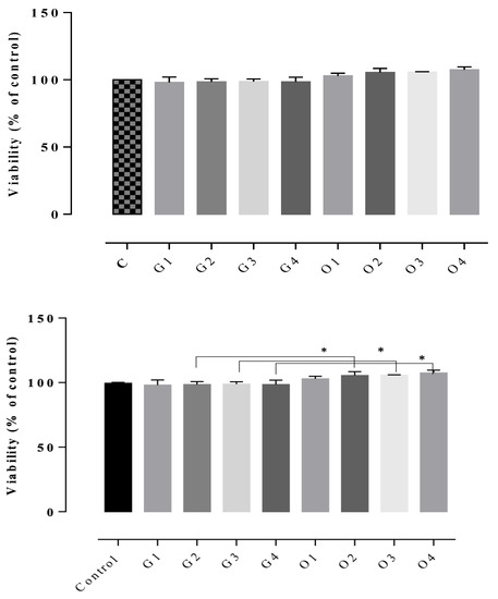 D1MSCs cells viability assessment after treatment with control gel and gel with Oregano® essential oil, where Control = D1MSCs cells in normal propagation medium; G1, 2, 3, 4 = the gel without essential oil in 4 different concentrations (2.4; 4.7; 7 and 9% (v/v)); O = the gel with Oregano® essential oil in 4 different concentrations of gels (2.4; 4.7; 7 and 9% (v/v)), * p < 0.05.