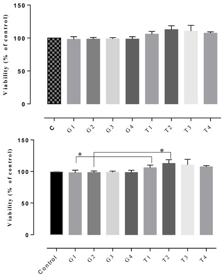 D1MSCs cells viability assessment after treatment with control gel and gel with Thieves® essential oil, where Control = D1MSCs cells in normal propagation medium; G1, 2, 3, 4 = the gel without essential oil in 4 different concentrations (2.4; 4.7; 7 and 9% (v/v)); T = the gel with Thieves® essential oil in 4 different concentrations of gels (2.4; 4.7; 7 and 9% (v/v)), * p < 0.05.
