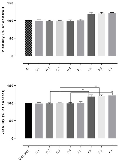 D1MSCs cells viability assessment after treatment with control gel and gel with Frankincense® essential oil, where Control = D1MSCs cells in normal propagation medium; G1, 2, 3, 4 = the gel without essential oil in 4 different concentrations (2.4; 4.7; 7 and 9% (v/v)); F = the gel with Frankincense® essential oil in 4 different concentrations of gels (2.4; 4.7; 7 and 9% (v/v)), ** p < 0.001.