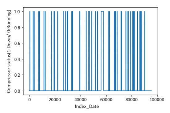 Here, we merged all the variables in a single file which contains, at the beginning, a column reserved for the dates and the rest for our attributes. Then, this file was divided into two sections: one that contained only the variables whose output is a continuous value and the second that contained only the attributes of discrete types. The data were then processed by normalizing and cleaning them as explained above. After merging all the variables and distinguishing the discrete and continuous attributes, we defined the target variable to be predicted later. Indeed, in our dataset we did not find an exact variable that provides the state of operation and which stops the direct compressor. Consequently, we thought of creating this variable, which takes 0 if the compressor is in a working state and 1 in case of stoppage or failure. This variable has the abbreviation CP01. Thus, the target variable was created thanks to two variables: VAR 1, which calculates the flow of the compressor and which must be lower than 2, i.e., so it does not deliver any more air, and VAR 2, which must be on a stop or failure. If both conditions are met, a failure occurs, i.e., CP01 =1, and otherwise CP01 = 0.