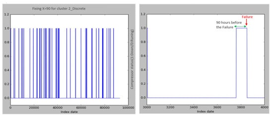 - Setting X hours before the failure occurs: This method involves calculating the probability that the compressor will fail in the next X hours. For this purpose, we take “1” as the state of the failure and for X hours and “0” for the other records.