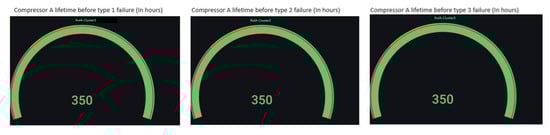 Almost every company has valuable data that internal teams need to access and analyze. Non-technical teams often need the tools to make their jobs easier. Instead of having to query a data scientist for every query, these teams want dynamic dashboards or tools where they can easily run queries and display interactive, custom visualizations. Clean, containerized code is not easy for users to interact with in machine learning models. The easiest way to solve this problem is to place the model behind an API and expose it via interfaces. For the analysis and formatting of the data in the form of counters, graphs, gauges, etc., Grafana is applied. It is a tool for chronological data visualization. It allows creating data representations in a simple interface compatible with Windows, Mac, and Android. Thus, it is arrangeable with several types of databases, including Influx DB. After inserting the dataset containing the RUL, we have access to visualize the gauges of the figure below (Figure 19), which shows the remaining lifetimes for each cluster we have in the database. The number displayed, “350”, shows that the compressor state is stable and works very well. As time goes by, this number is decremented. Once the value is less than or equal to 210 h, a notification is displayed to warn the operators of the status of the compressor.