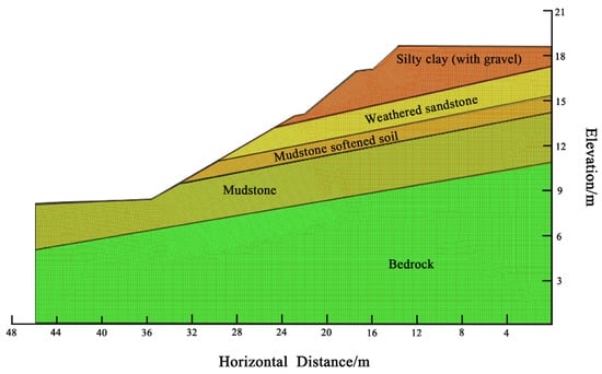 In Northeast China, sandstone-mudstone interbedding is a typical stratigraphic distribution. Both sandstone and mudstone are sedimentary rocks. Among them, sandstone has great weathering resistance and good permeability, and surface water can easily permeate it. Mudstone, on the other hand, has low strength, weak permeability and is quickly absorbed and softened by water [1]. It is a slippery stratum in engineering construction. In recent years, the trend of summer rainfall in Northeast China increased [2]. Due to the rain erosion and temperature change, the exposed mudstone interlayer will disintegrate and soften quickly. This weakens the layer and reduces its strength, which causes a significant drop in the slope safety factor and even destabilization [3,4]. Therefore, the sandstone–mudstone interlayer’s slope stability problem has increasingly caught the attention of academics working in the area.