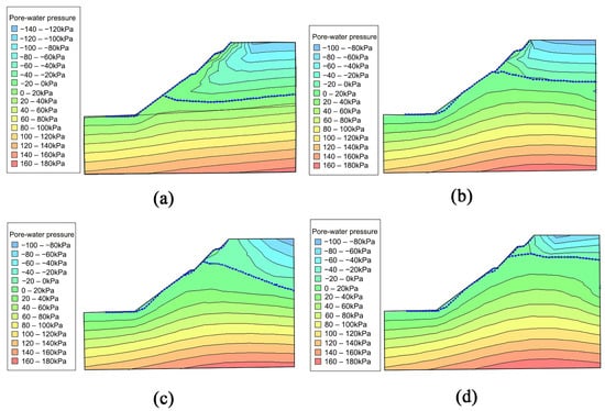 Pore water pressure distribution for each working condition, where the blue dashed line is the phreatic line. (a) Working condition I; (b) Working condition II; (c) Working condition III; (d) Working condition IV.