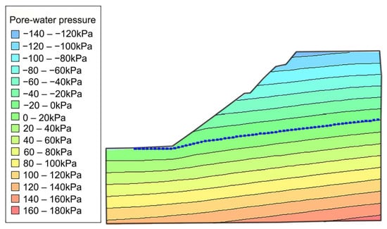 Pore water pressure distribution in a natural state, where the blue dashed line is the phreatic line.